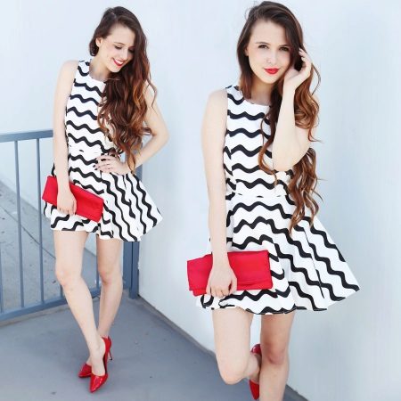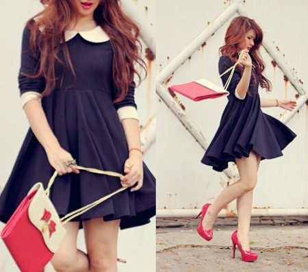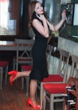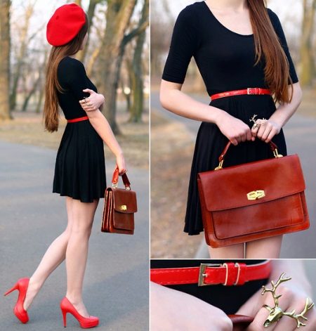 - Simplicity, complemented by bright details - the key to a great stylish look! A black dress with a tight top and a sleeve to the elbow and bottoms in the form of a free light skirt above the knee looks great with such stylish decorative details as a beret, a thin belt at the waist and stylish red high-heeled shoes.