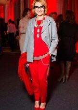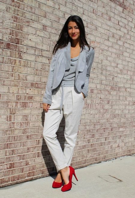 - Bright things always need some bright details, otherwise the image will turn out to be simply bland. Therefore, the combination of white linen trousers, a gray top and a jacket of the same shade will look great with bright suede shoes of a juicy red shade.