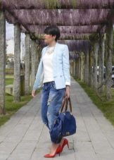 - An outfit of completely ordinary things that can be found in the wardrobe of any girl. Tight blue jeans with a print and shades, in the style of "jam", a white T-shirt with any stylish print and a black jacket on one button - always go well together.