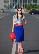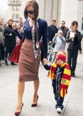 - With whom, if not Victoria Beckham, to take an example, choosing her outfit, because she is a real style icon! The girl has a rather simple combination of a blue tight blouse and a brown skirt - a pencil up to the knee.