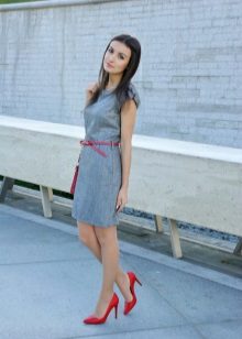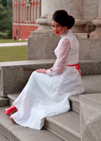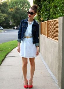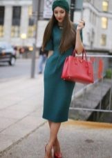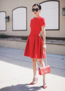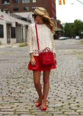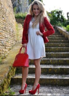 - Another proof that simple things, complemented by bright colors, always look much more advantageous than the most outlandish things. And therefore, a white knee-length dress with a straight style with a straight long sleeve will look great with a necklace of large red stones, a large suitcase bag and beautiful red low-heeled boats decorated with a small bow.
