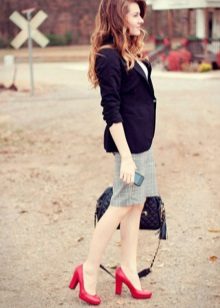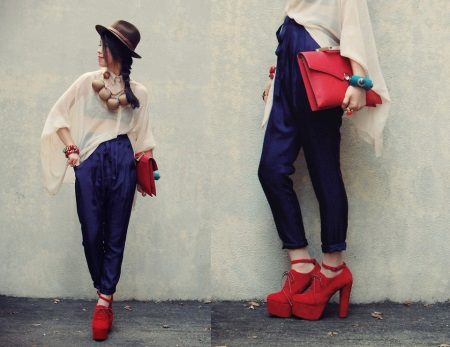 And red leather shoes with medium heels will make a splash and will become the highlight of the whole outfit.
