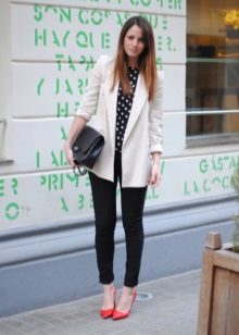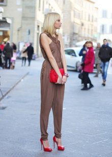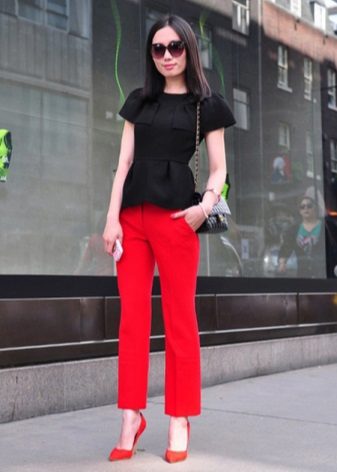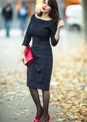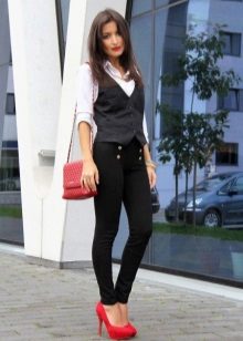Without bright details, the image would be boring, so you should complement it with a large rectangular clutch and stylish red low-heeled shoes with a sharp nose and a wide strap in the ankle.