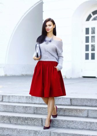 It is supplemented with everything with a light thin scarf around the neck, a small handbag and breathtaking dark red shoes with a slightly pointed toe.