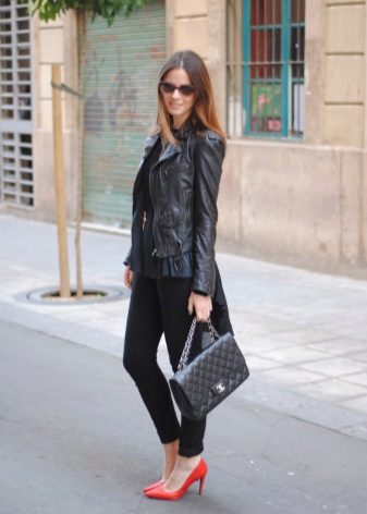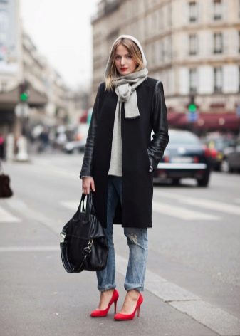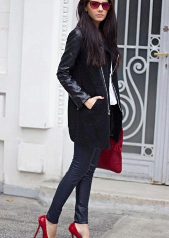 A black coat with leather sleeves and a large leather bag are functional details of the outfit, while bright red shoes are a great addition to it.