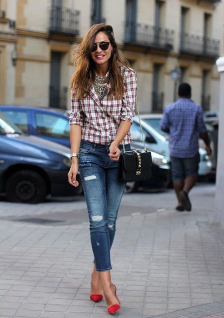 - Everyday things go well with country-style details and unusual accessories. A plaid shirt and skinny ripped jeans are a great guarantee of success for everyday use! Massive jewelry around the neck and a sophisticated small black handbag will be a great addition to this outfit.