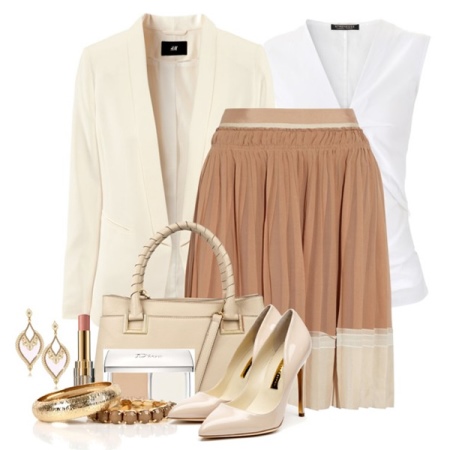 The beige and brown palette of dresses, skirts, trousers, capri jackets, blouses and tunics is a classic in combining color with the tone of shoes. You can create the perfect look by pairing a cocoa-colored skirt with a snow-white top, delicate beige cardigan and cream shoes. The golden accessory completes the look.