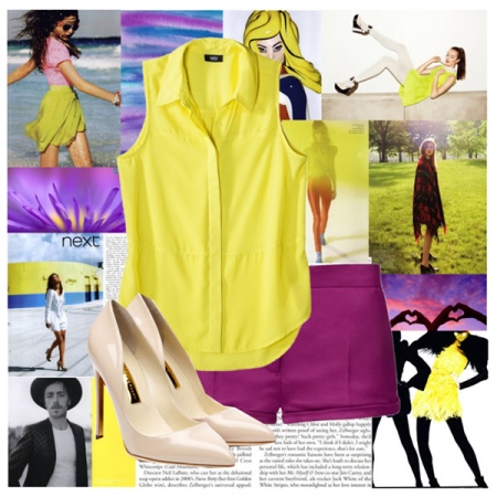 Bold images with bright clothes form spectacular bows. Bright purple shorts with a yellow sleeveless blouse and cream shoes will surprise the most daring fashionistas. A red check skirt, a black turtleneck, and a purple blazer can create a warm style.