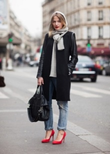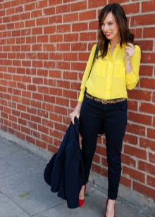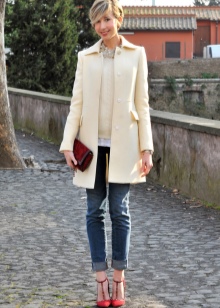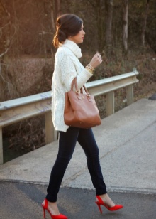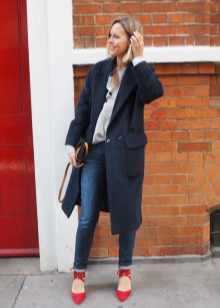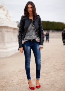 Successful looks are obtained with jeans of a classic or shortened length. Top to jeans is also worth choosing a basic and plain. Large jewelry and accessories with red elements are acceptable.