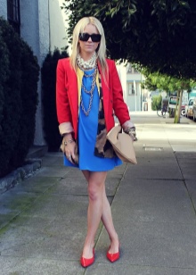 For lovers of bright summer looks, clothing in contrasting colors is suitable. Yellow, blue and green colors will help to create a bright memorable image with red shoes. A small red handbag can complement this outfit.