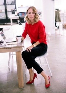 Red shoes are best combined with dresses, skirts and trousers of basic tones. Wearing clothes of a neutral color, you can add a red belt, as well as lipstick or manicure to match the shoes.