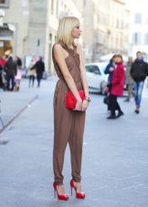 Such a suit can be made in beige or gold shade. It is possible that there is a deep neckline and open hands in order to emphasize the femininity and sexuality of its owner. A stylish clutch matching the shoes can be used as an additional accessory.
