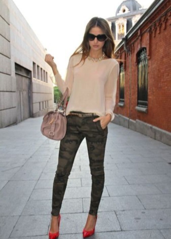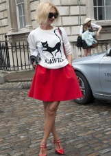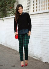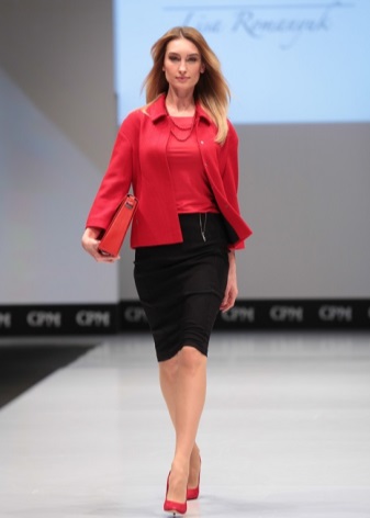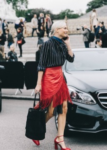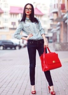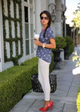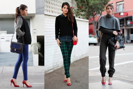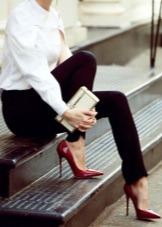 Any business woman will be able to emphasize her status with spectacular red pumps. In this case, stylists advise paying attention to shoes of darker red shades - wine or scarlet. Such an accessory will most effectively complement the bow, consisting of classic narrow trousers and a light shirt or blouse in a small pattern.