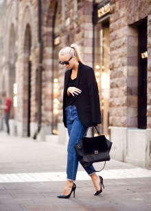Black lacquered boats with low or high heels will be an ideal option. Such shoes play a leading role in the suit, do not abuse the details. A strict gray suit with a skirt or trousers and a strict bag are best suited for such shoes.