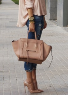 But here one should not go too far with accessories, even if the choice fell on the varnish dorsi of a gentle beige shade, their luster will be noticeable from afar. It would be a great success if such a heeled-glass model is found in the store: wide at the top and tapering downward, turning into a thin stiletto heel. Shoes of such a plan can be combined with even with an official image.