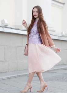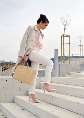 - Milk-colored shoes will look more conservative together with things of delicate blue and pink colors.