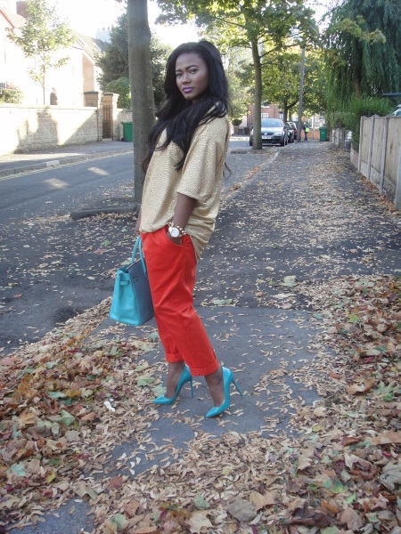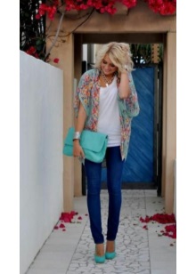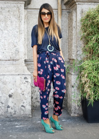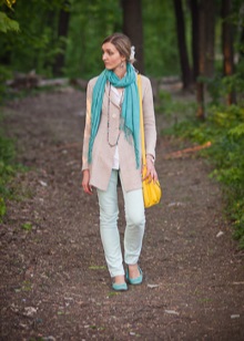 Mint shoes with beige trousers look beautiful. Add a brightness bow to a T-shirt with a print to match the shoes and a spectacular scarf. Without a contrasting green handbag, the image would not be complete.