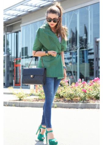 A green jacket in tandem with skinny jeans and mint slippers looks stylish. The final element of an attractive look will be a small black handbag.