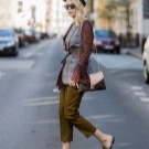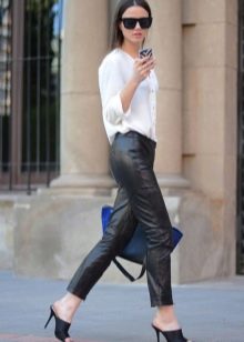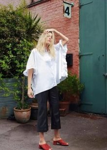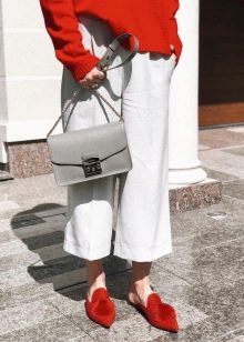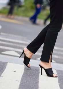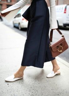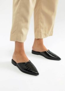 - If you prefer to wear pants, then pay attention to flared styles. Culottes with a shortened silhouette perfectly complement the look with the mule. Also, such shoes look good with bananas, the length of which is above the ankle.