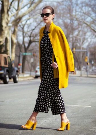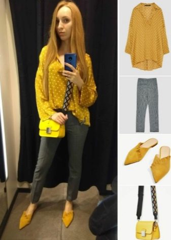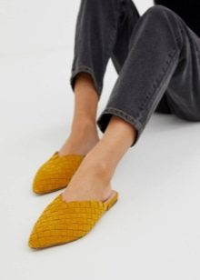- Footwear mustard color It harmonizes well with clothes in rich yellow tones. And instead of mustard, brown mules can be used. They pair with khaki pants and blue jeans.