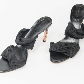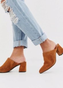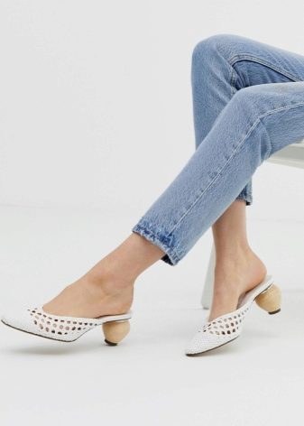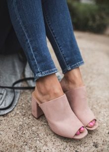 Another kind of mule implies the presence of a heel. It can be different - both square and not very high, and very thin and elegant. Different wardrobe items harmonize with similar shoes.