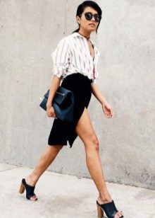 In everyday outfit, mules should not be overloaded with decorative elements. They look great complete with clothes such as oversize dresses. Such a dress or a mid-length skirt can be supplemented with a black jacket or even a sweatshirt.