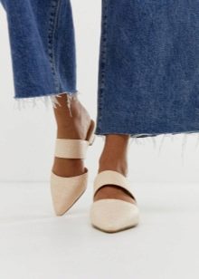 For an office set of clothes, high-heeled mules are in most cases an unsuitable option. More comfortable models on a low sole will perfectly combine with straight cut trousers and even with a pencil skirt. However, remember that the option of smooth leather with a closed nose will not be very relevant for a business image, it is better to leave it for informal exits. The best option for work is Kitten Hills models with heels in the front look very similar to boats.