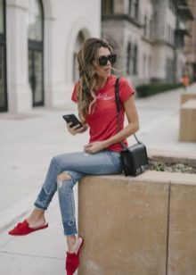 - Red mules can act as an accent in an image devoid of red. And also they can be an addition if a similar shade is also present in the upper part of the outfit.