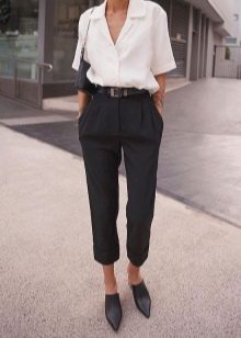 - The top of the outfit can be blouses without prints or a shirt. When choosing sweaters from thicker fabrics, pay attention to the fact that they create smooth lines in the image, are not overloaded with ornaments and complex color combinations.