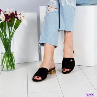 - Popular models like black mules with a gold heel. They look good with light pants, as well as with dark trousers or jeans, provided that the upper part of the image will contain lighter fabrics.