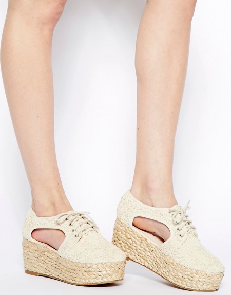 - Espadrilles - this is what Catalonia traditionally called shoes with fabric tops and rope soles. Now fashionable shoes with this name can be not only on wedges or just on the platform, individual models are made with thick heels.