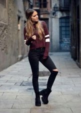 As additional materials I use velvet fringe, jeans inserts. Shoes with a tractor sole are very effective, therefore, as a decorative element, they take laconic, but not infrequently bold metal rivets and spikes.