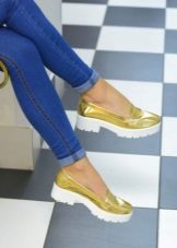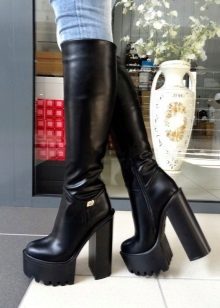 An unconventional model that is a mix of knee-high boots and shoesalso made on embossed soles. Such shoes more often than ordinary shoes are decorated and decorated with all kinds of elements. This season it is popular to use outrageous jewelry, although they are rarely found on shoes with such a massive sole, but trendy sequins and prints are quite acceptable. Among the decor, metal rivets stand out that are ideally combined with the daring look of massive shoes.