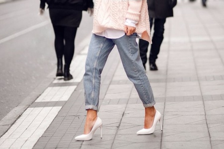 In addition, white shoes are in harmony with good old jeans. Jeans can have both a classic color (blue, blue) and have more original shades (burgundy, indigo, dark green, pink).