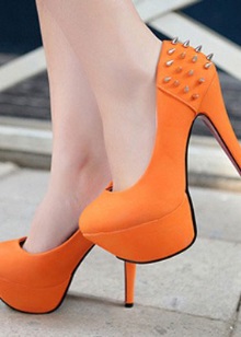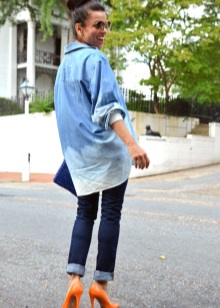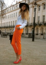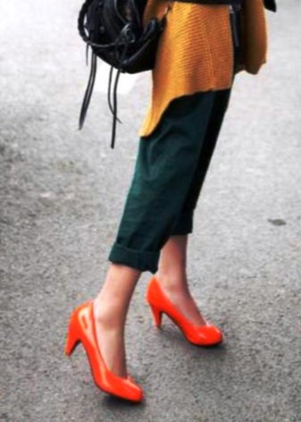 Of the decor elements, designers and stylists advise choosing only yellow metal fasteners, spikes and metal rivets in small quantities for orange shoes. All this is necessary in order not to overload the image with unnecessary details.