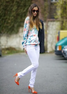 It looks very profitable, sometimes even elegant. Bright orange pumps of any texture will look very feminine and gentle with a light summer white dress.