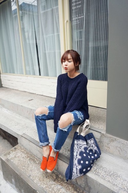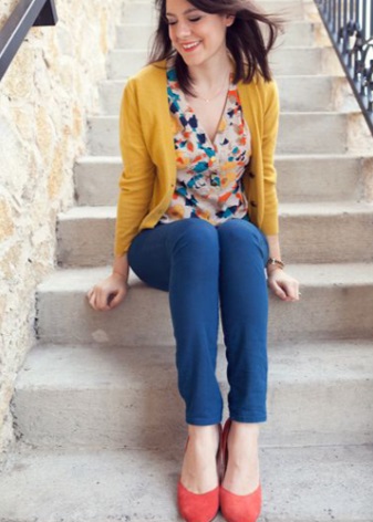 The blue color is considered quite contrasting with orange, however, and it decently fits under the bright shoes of citrus colors. So, blue and blue jeans go well with a plain pastel top and orange flat shoes or wedges.