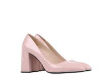 Delicate polished leather Prada pumps in rough square heels look rather unusual. Plain models with a pointed toe are an ideal solution for a strictly office outfit. Square-heeled boats look original and at the same time very solid.