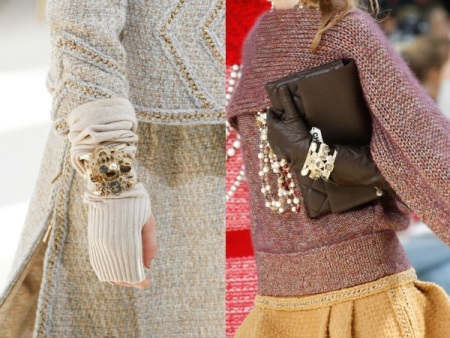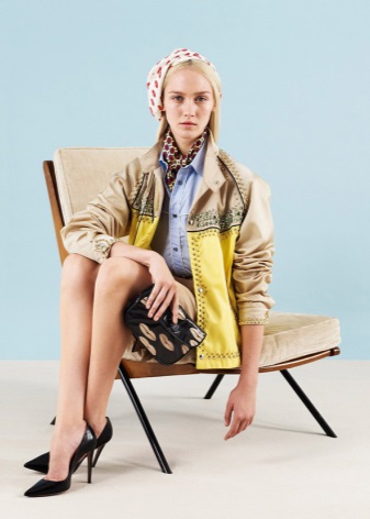 With fashionable Prada shoes, signature handbags and clutches in patent or matte leather look great. An image complemented by such accessories with fur inserts or metallized details will look very expensive and chic.