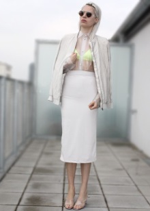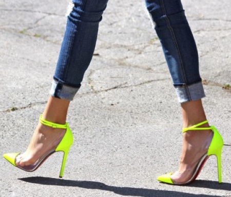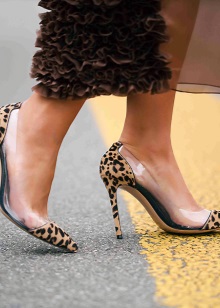 Models with a transparent top and a regular sole and heel will fit many elements of a women's wardrobe. Such models look good with dresses and skirts of various styles, as well as trousers of shortened models. You should not choose long skirts for such shoes that are able to close the original shoes.