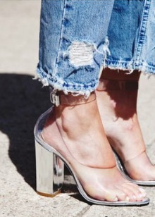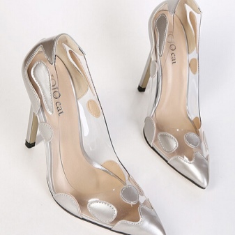- Shoes with a transparent top. Such models have a sole and a heel like ordinary shoes, but the upper part is made of transparent silicone. Shoes with a transparent top with heels will be a great option for girls of short stature, because with such shoes you can achieve the effect of lengthening the legs.
