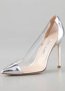 - Shoes with transparent inserts. Not so extravagant and more ordinary look models of shoes with silicone inserts. Boats with transparent inserts on the sides look more open and fit well with light summer outfits. Models with a transparent ankle strap will fix shoes well on the foot, but will not shorten their legs, which is typical for shoes with a strap.