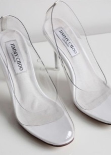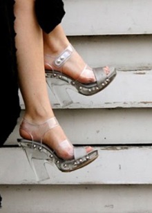 - Completely transparent shoes. All elements in these shoes are made of transparent materials. Such shoes are quite versatile and go well with a large number of outfits to create an original female look. The highlight in these shoes can be an unusual decor. Choosing accessories for completely transparent models of shoes, you should give preference to neat miniature accessories, as bright massive details can overload the image.