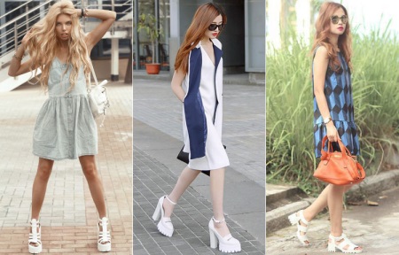These shoes with white soles look very harmonious in tandem with short tight-fitting or loose dresses, as well as long and short skirts made of flowing materials.