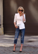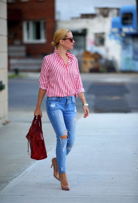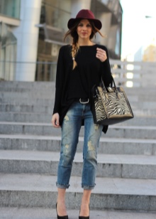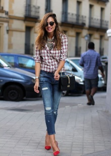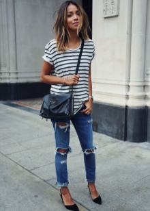 Ripped jeans evoke a rebellious spirit, so the choice of shoes for them is more diverse. A bow can be athletic, homely, boyish, and even romantic and sexy. A win-win kit option will be torn skinny and loafers or ballet flats. Bots will give the image a rude soldier look.