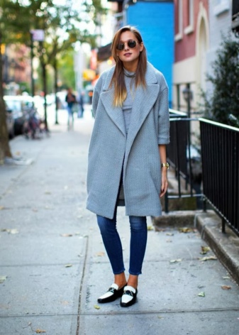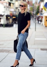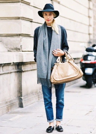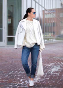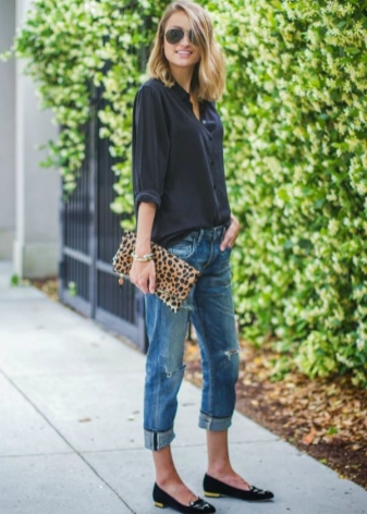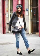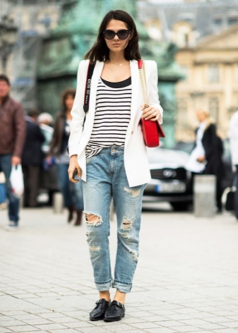 Comfortable loafers will decorate boyfriends with a twist and rare vertical scuffs, a gray T-shirt with large letters. Whitened jeans complete with a sweatshirt of a similar tone will harmoniously look with combined boats of light and contrasting shades. Ballet shoes perfectly emphasize luxury.