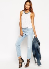 Ensembles of tight jeans and sandals make up a special line of popularity. Light pairs with a flat sole, an average heel or on a hairpin look ideally not only with tight-fitting styles, but also with pipes, and also with classics.
