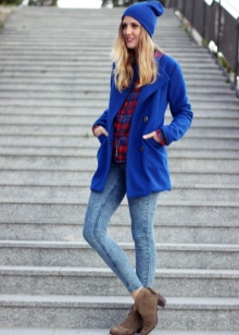 City rhythm is created from blue demima, coffee sweatshirt, beige raincoat above the knee. Low boats, made in the same color scheme with a cloak, a chiffon scarf and a small handbag, complete the style. The ensemble decor will be large contrast buttons on the cloak and gold-plated metal fittings of the trouser belt.