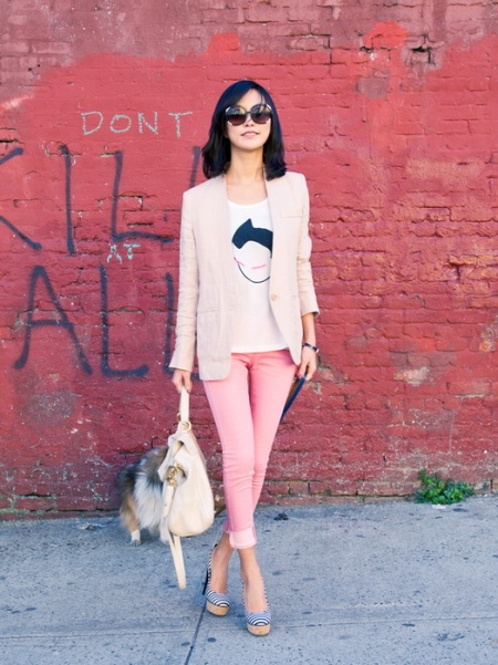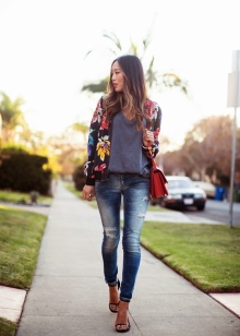 You can create a romantic look with any style: unisex, boyfriend or classic cut. To do this, choose a beautiful silk or chiffon blouse and a semi-adjacent jacket with a floral print. Loose trousers with a turn-up or narrow skinny are perfect for such a top. Boats or ballet flats will add femininity and allow you to take a fresh look at jeans.