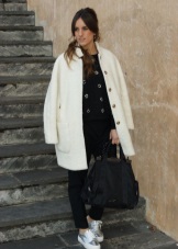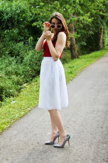 Clothing in red matches beautifully with white and black. And the complement of the image will be silver shoes. Shoes with a white jacket, a black skirt and a red jacket look unusual and fashionable. If the combination of colors is not enough for you, then the bag with the original print will add an effect to the image.